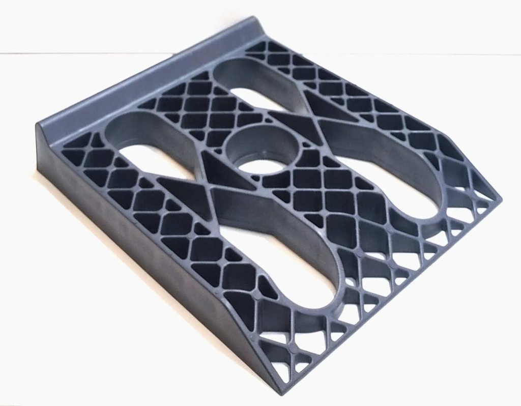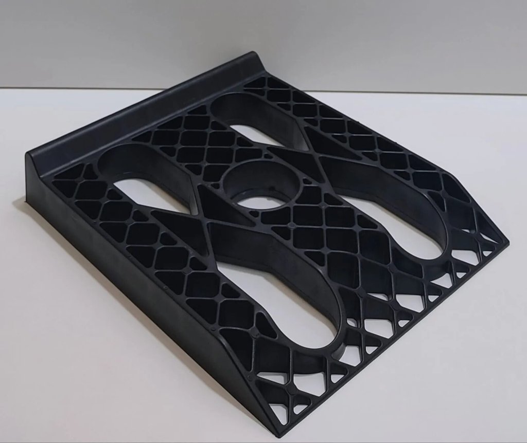 A capacidade de carga da Meia Pata é de 40 toneladas por jogo, e o material utilizado é o polipropileno reciclado com 20% de carga mineral, tornando a rampa ecologicamente correta e sustentável. Cada jogo pesa 3,2kg e possui dimensões de 30cm de comprimento, 25cm de largura e 3,5cm de altura.